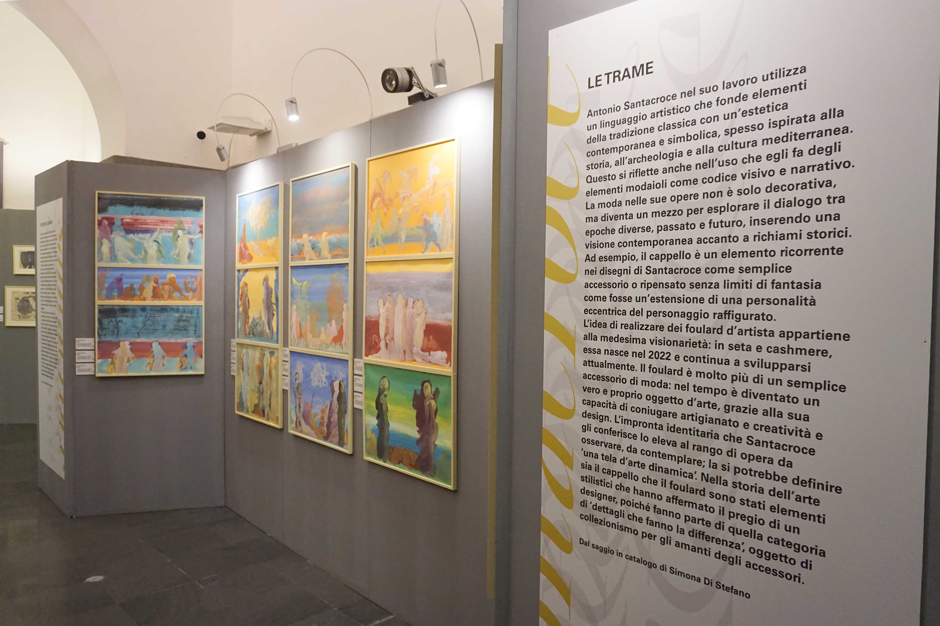 Numerosi inediti offrono uno sguardo privilegiato su snodi centrali del suo percorso: la lunga e assidua frequentazione con carte e cartiere, che diventano ossatura tecnica e concettuale di un modus operandi assolutamente singolare; e ancora il Santacroce designer del tessile — forse la declinazione più recente e sorprendente della sua ricerca — già intuita nei celebri “personaggi con cappello” in pittura, disegno e incisione, poi consolidatasi in un vero e proprio brand, dove arte e progetto dialogano senza soluzione di continuità.