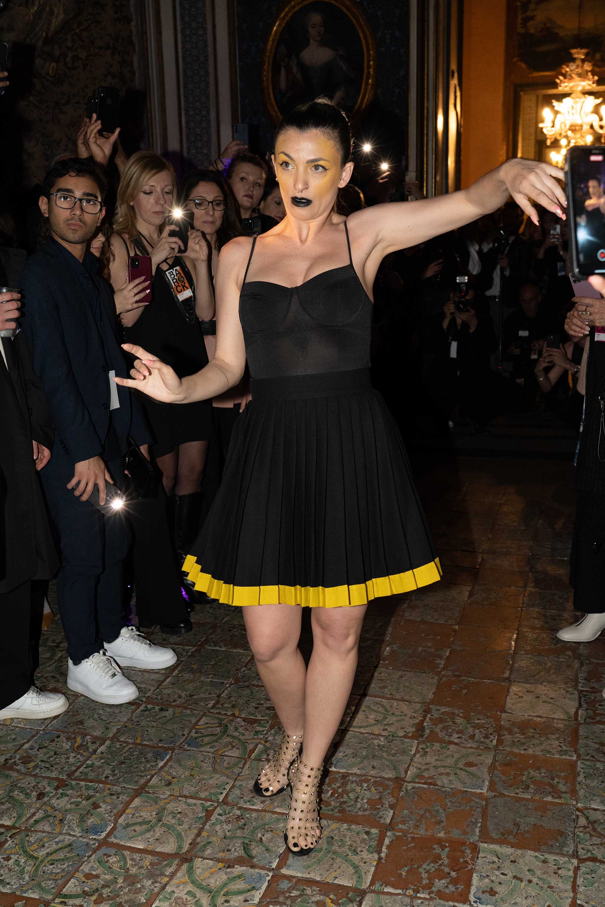 Le creazioni dello stilista, esposte nel salone da ballo del palazzo e ispirate a uno stile rock e total black, hanno visto protagonisti capi in pelle decorati da borchie e spille da balia XL che chiudono scollature e spacchi profondi.