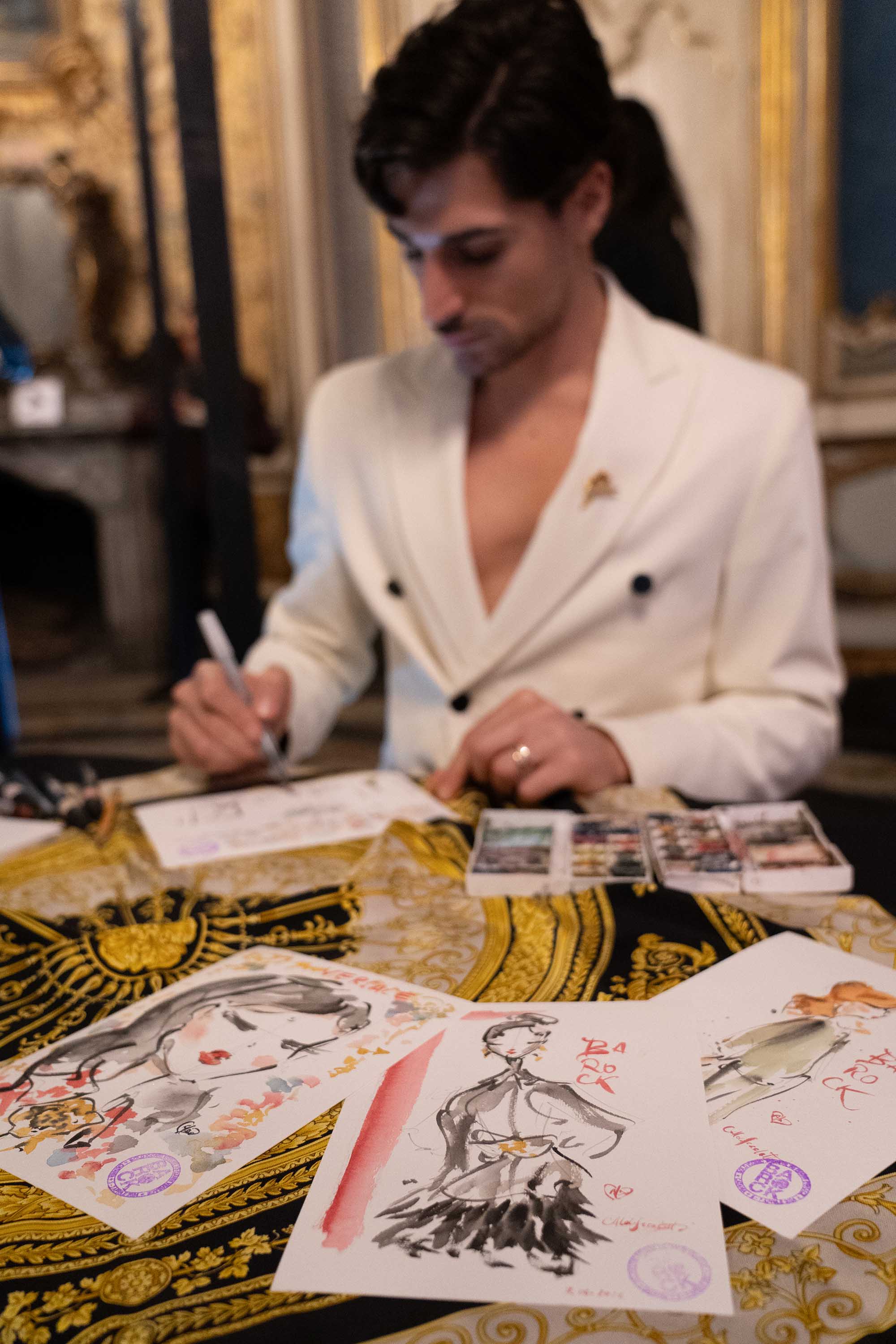 Durante l’ultima serata la collezione Versace e il salone in cui è stata esposta sono stati fonte di ispirazione per Aldo Sacchetti, fashion designer, grafico e illustratore che ha intrattenuto gli ospiti realizzando dei bozzetti in cui ha mixato il proprio tratto artistico al “contenitore” e al “contenuto”.