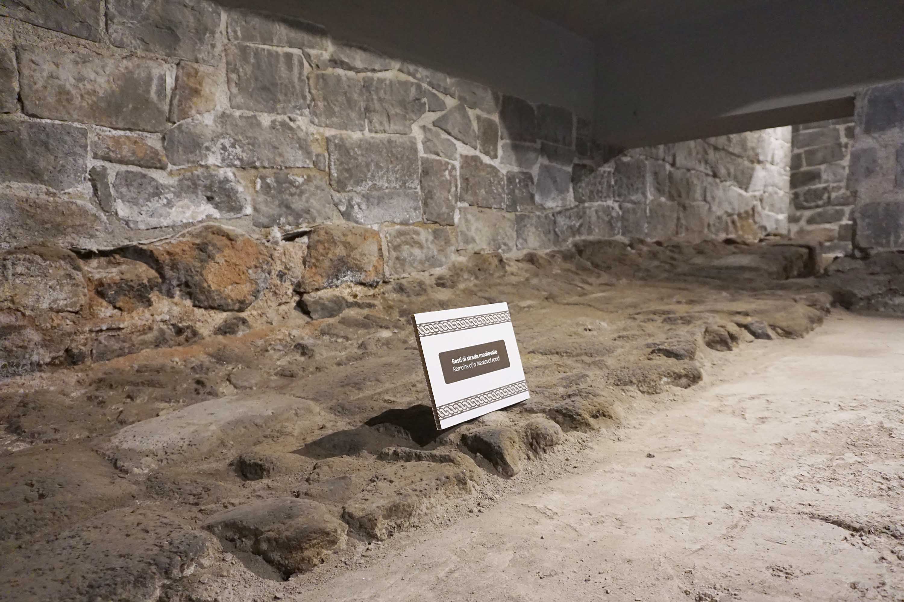 I resti di una strada medievale — e sembra di sentirli ancora, i passi, le voci, il cigolio dei carri sul selciato. Un rumore antico, trattenuto nella pietra.