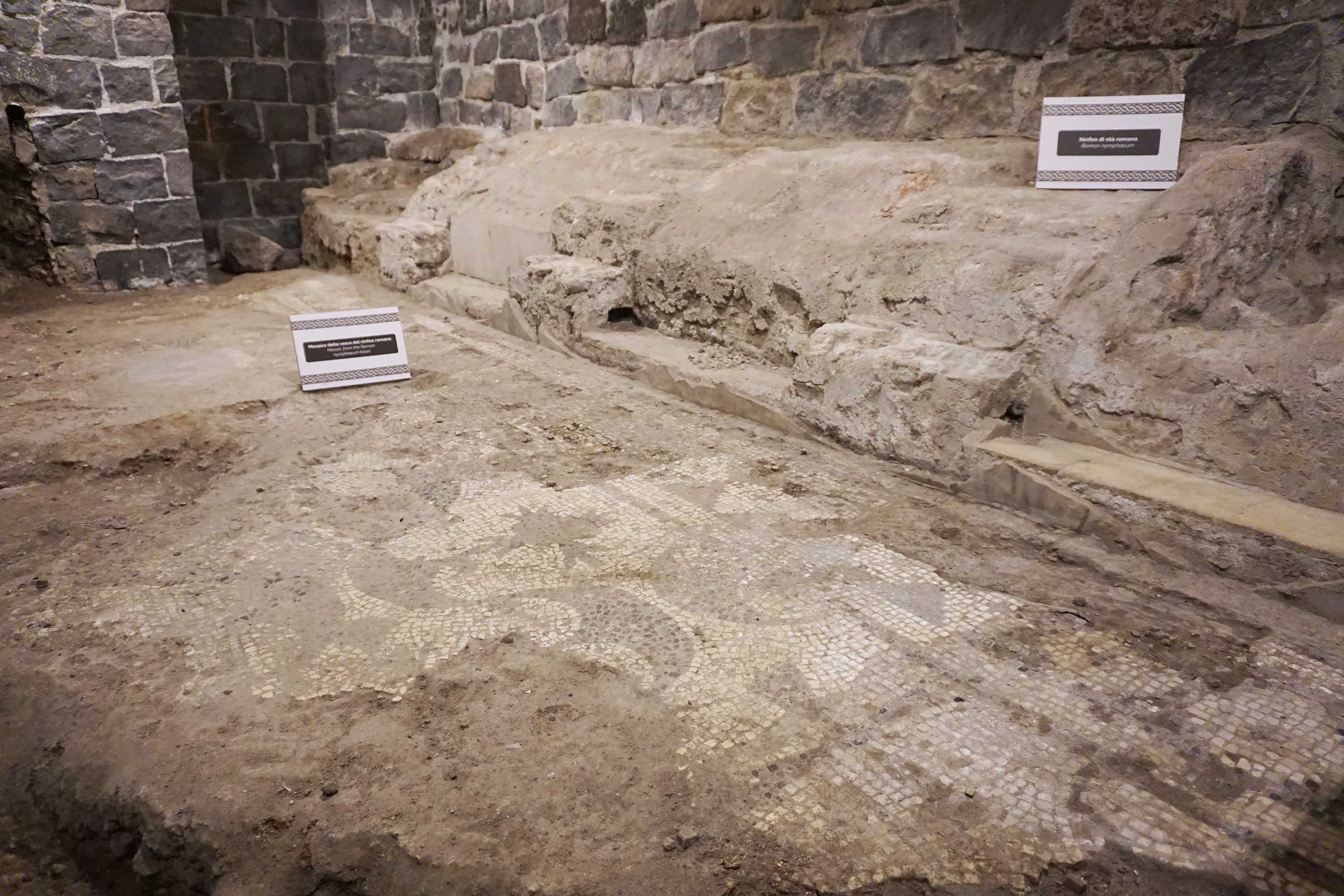 Più avanti il pavimento cambia, diventa mosaico. Tessere piccole, ordinate, nere, rosse, gialle e bianche. Disegnano un tappeto geometrico a spina di pesce, chiuso da una treccia continua che corre lungo il bordo. Le tessere sono minute, posate con pazienza: chi le ha posate, voleva che durassero. E sono durate.