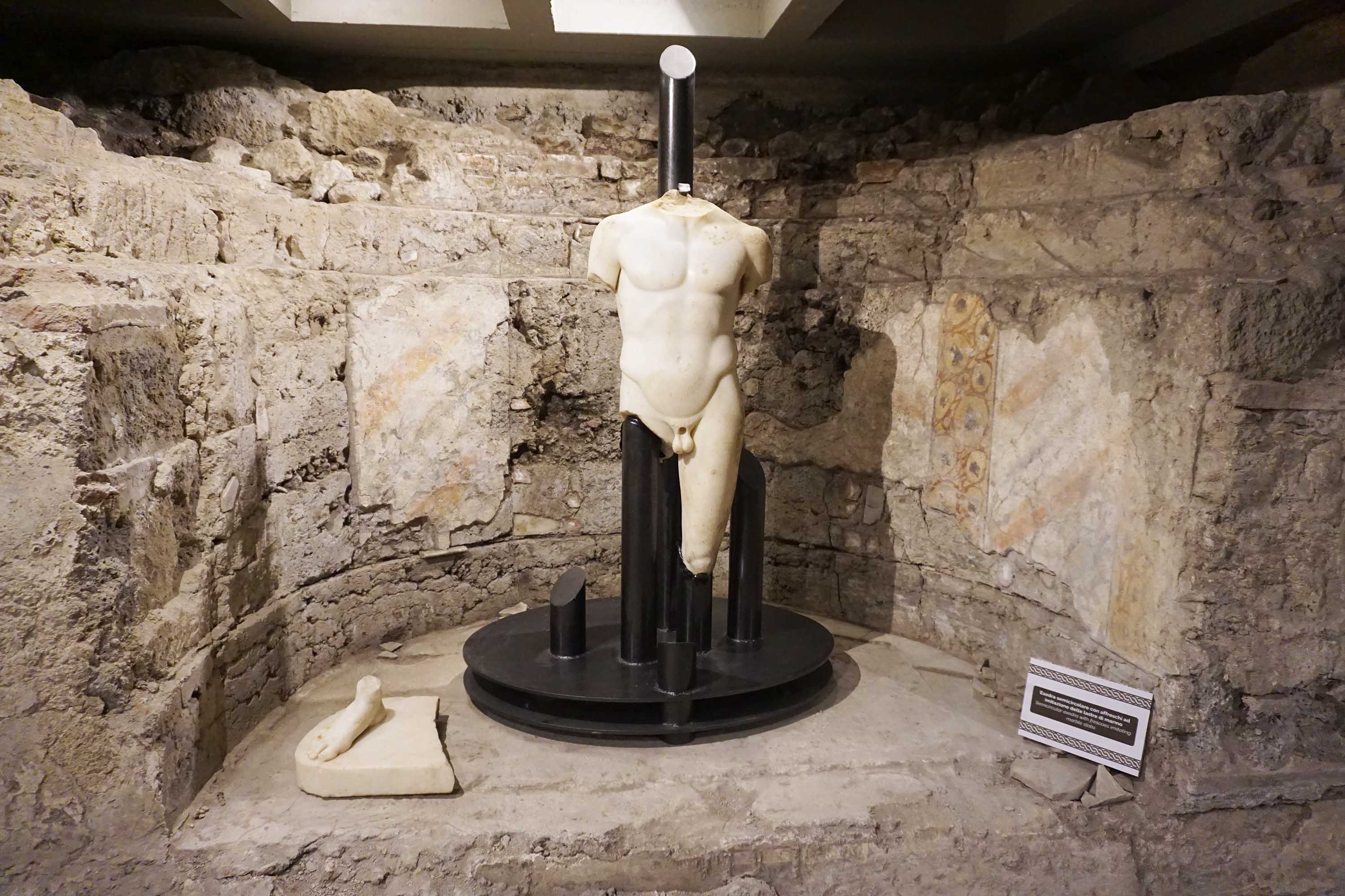 Un criptoportico romano — un corridoio coperto, seminterrato, costruito nel I secolo d.C. sul declivio della collina. Rimasto in uso per cinque secoli, poi frazionato, murato, dimenticato. Ritrovato per caso, quarant’anni fa, durante i lavori per una rete fognaria.