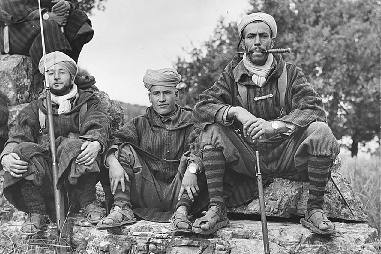 Goums, native Moroccan soldiers in the French Army, posing w. their weapons, on training maneuvers