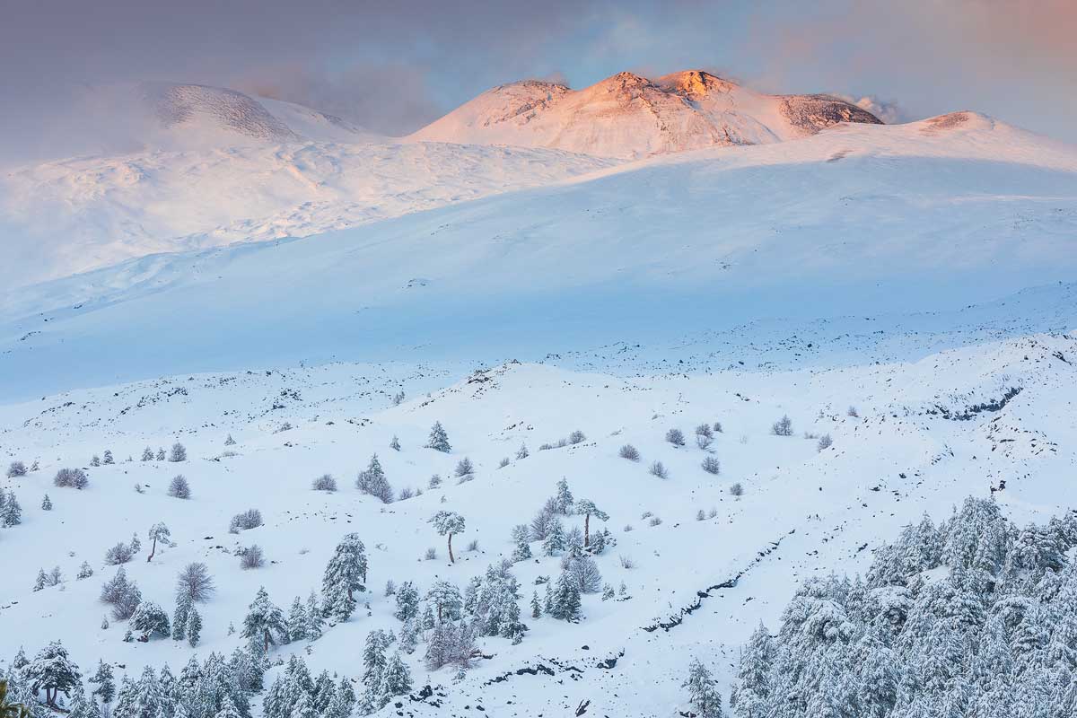 Osserverete i forti venti che spazzano i pendii dell'Etna, creando vortici di neve e ghiaccio che spazzano neri canali di sabbia vulcanica. Ammirerete le piccole stalattiti di ghiaccio che brillano nelle grotte di scorrimento lavico, come gioielli preziosi incastonati nella roccia.