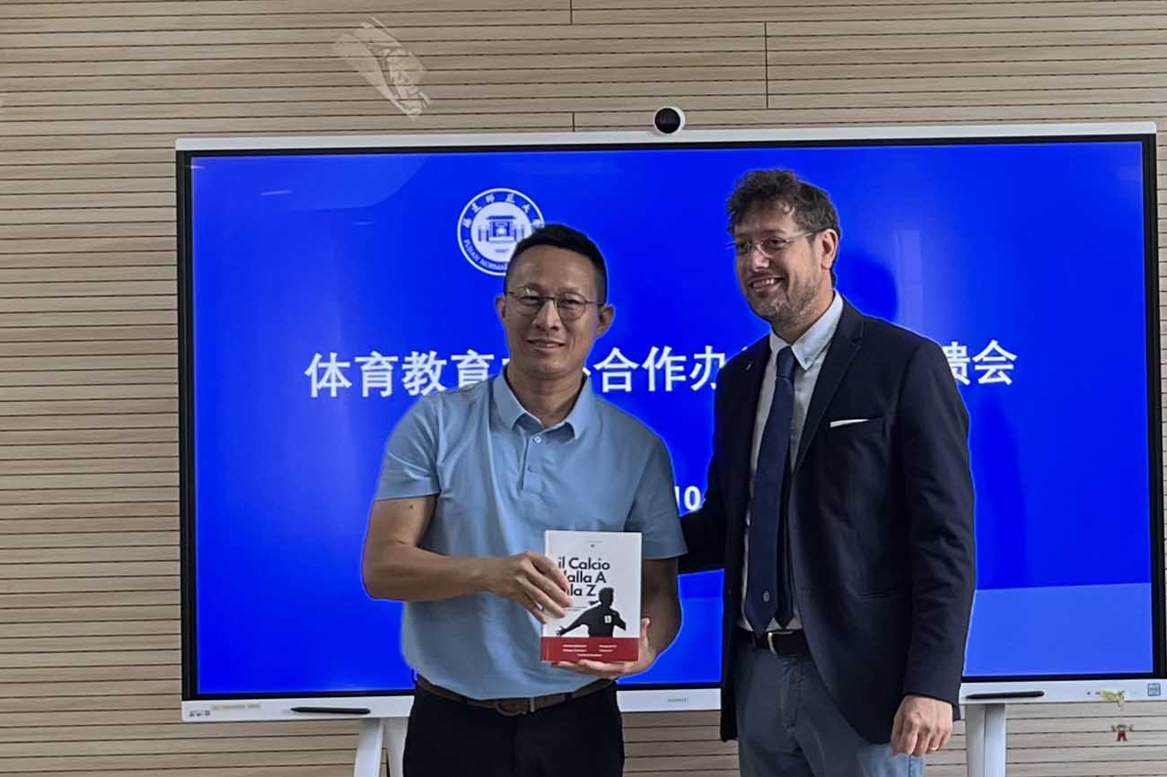 Il prof. Giuseppe Musumeci ha poi consegnato il libro Il Calcio dalla A alla Z. Teoria e pratica del gioco più bello del mondo, edito in lingua italiana e cinese dalla casa editrice il Glomerulo di Sale, che porta la firma di Salvatore Bianchetti, Giuseppe Musumeci, XU Wenxin e Xiangyang Cai (traduzione a cura della dott.ssa Bai Wei).