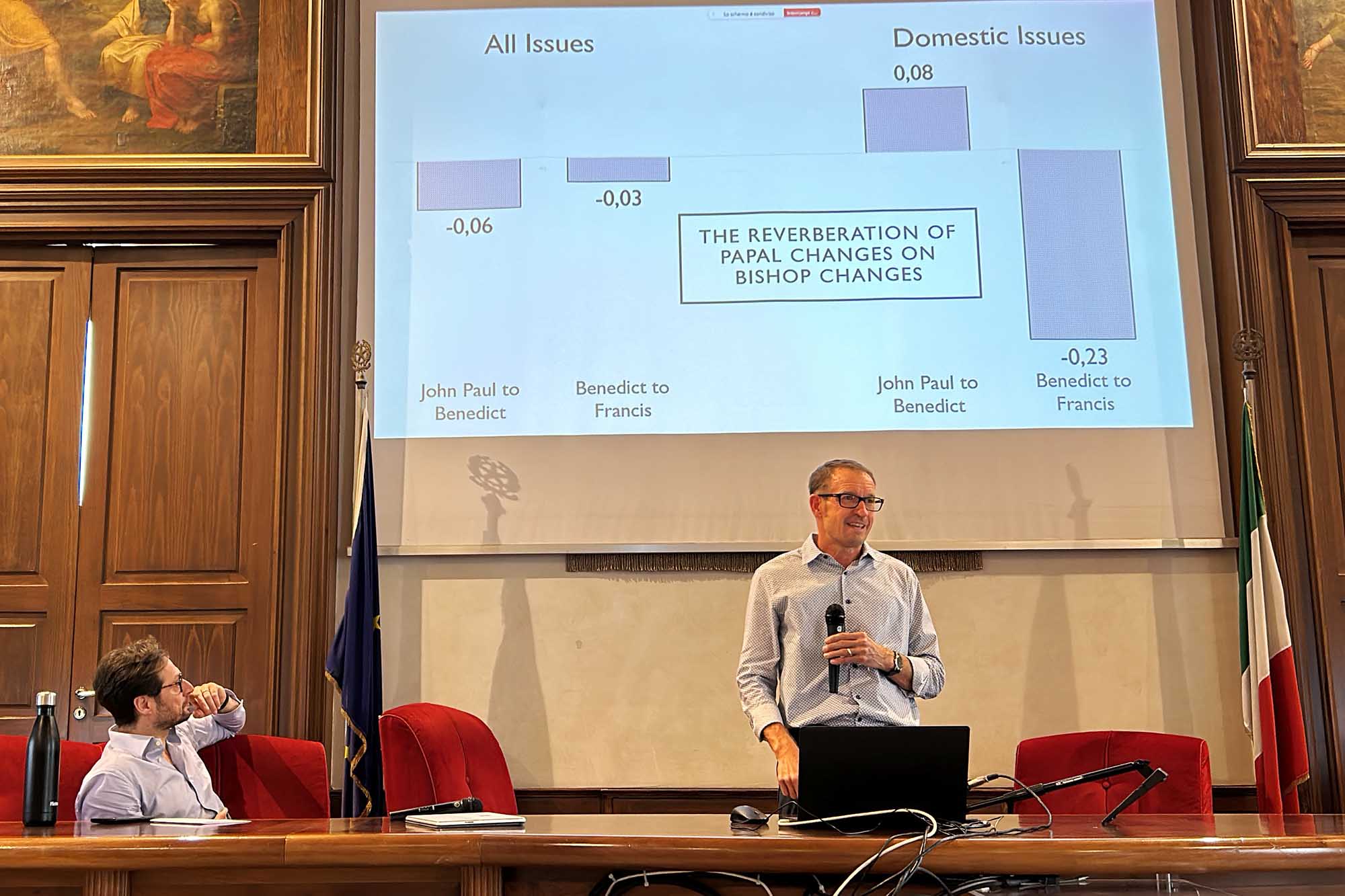 A seguire il prof. Sean M. Theriault, esperto nell’analisi delle istituzioni, ha esaminato il pontificato di Francesco in chiave comparativa, concentrandosi su tre aspetti principali: le politiche adottate, la selezione del personale e i viaggi pastorali. Lo studioso ha messo a confronto la struttura organizzativa del Congresso americano e quella della Città del Vaticano, evidenziando analogie non solo architettoniche, ma anche di governance.