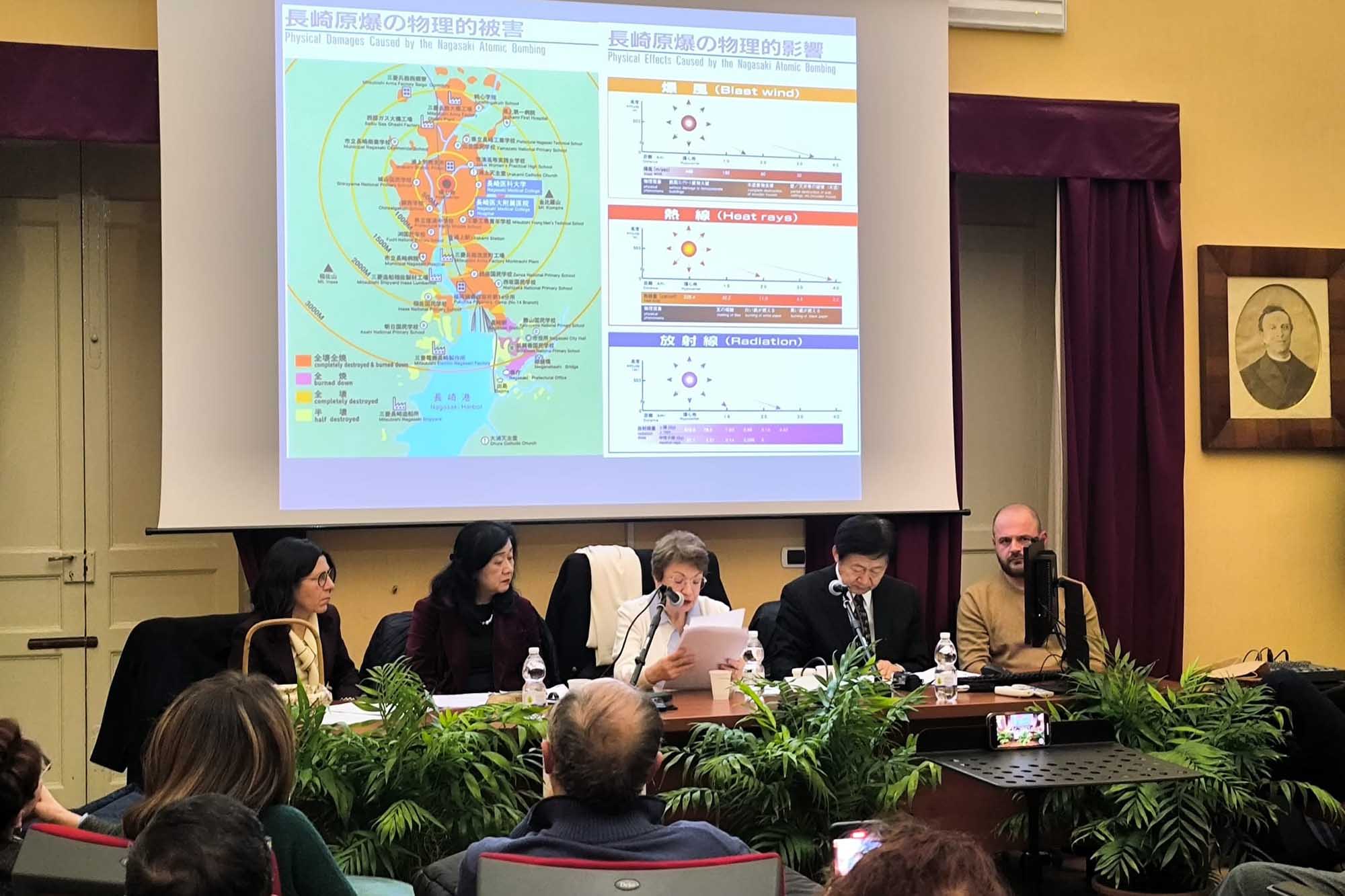 Testimone diretto dell’evento bellico del 1945 e sopravvissuto alle conseguenze dell’atomica, Masao Tomonaga, emerito della Facoltà di Medicina dell’Università di Nagasaki e vicepresidente dell’Independent Scientific Panel on the Effects of Nuclear War delle Nazioni Unite, ha illustrato analisi scientifiche indipendenti condotte per le Nazioni Unite delineando il quadro degli effetti a lungo termine delle radiazioni sul corpo umano e sulla psiche.