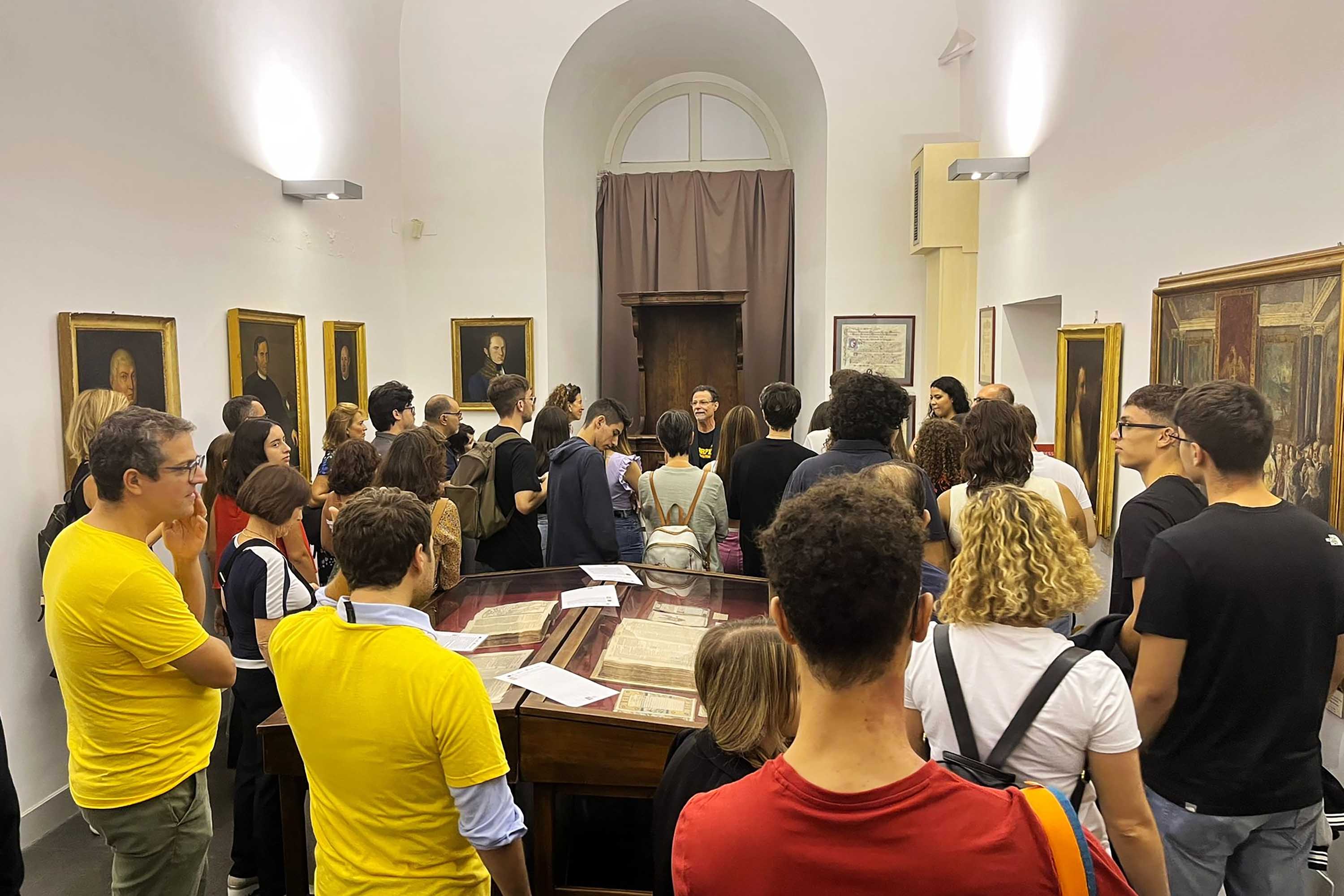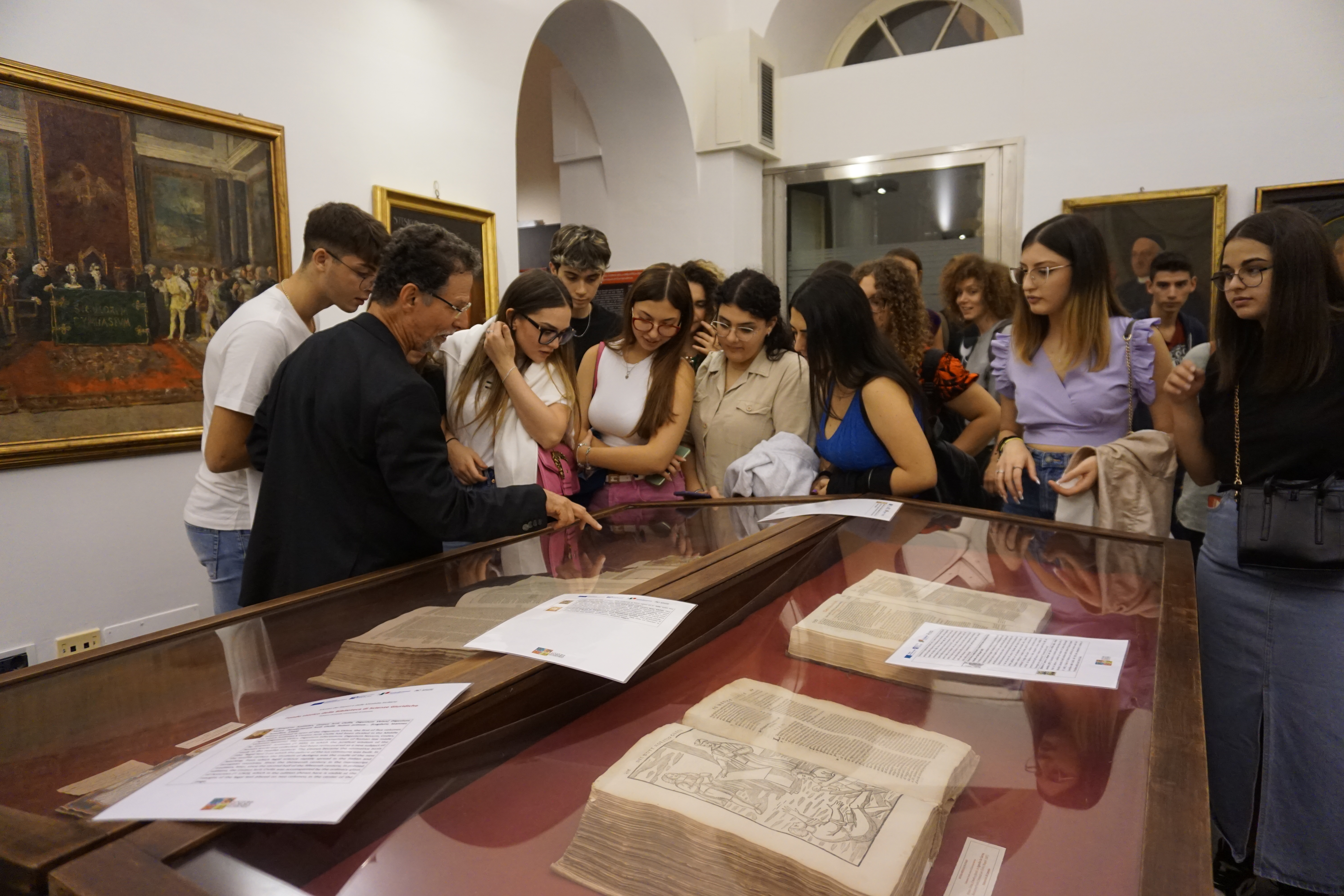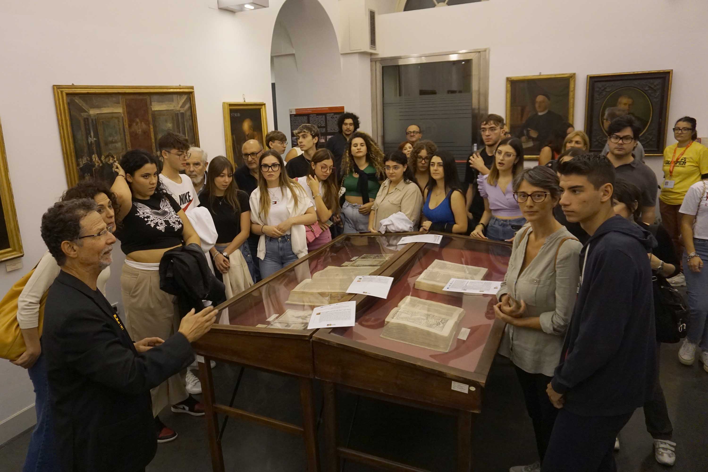 Il rettore Francesco Priolo illustra ai giovani visitatori alcuni documenti storici al Museo dei Saperi e delle Mirabilie siciliane