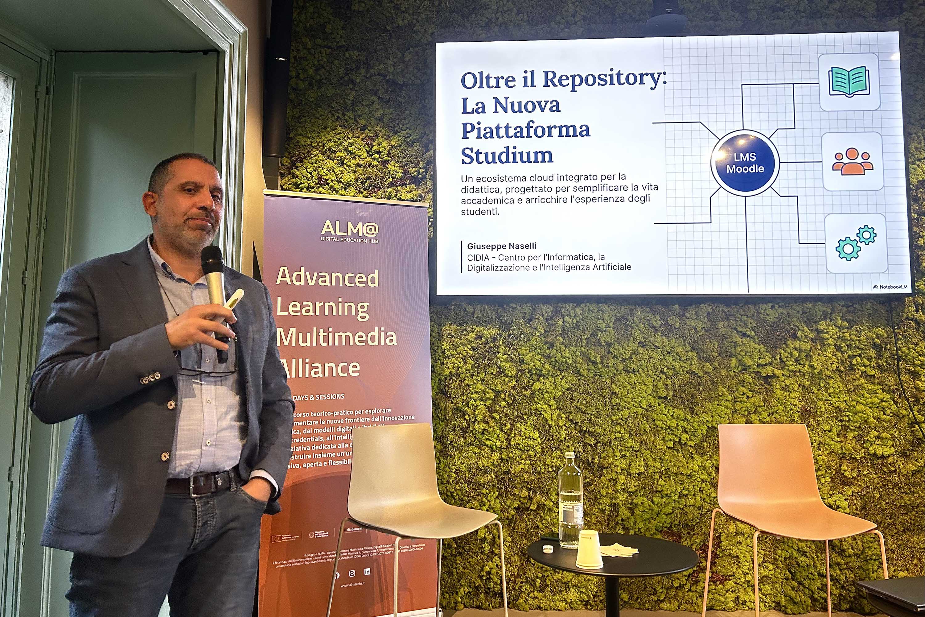«La nuova versione 4.5.1 della piattaforma digitale contiene l'intelligenza artificiale che consentirà agli studenti e ai docenti di generare contenuti e immagini per implementare l'offerta formativa». Con queste parole il dott. Giuseppe Naselli, responsabile del Sistema Informativo Integrato d’Ateneo del CIDIA - Centro per l’Informatica, la Digitalizzazione e l’Intelligenza Artificiale, ha introdotto il suo contributo al primo appuntamento degli ALMA Days & Sessions dedicati all'esplorazione delle nuove infrastrutture di Ateneo e alla sperimentazione dei programmi formativi digitali, che si svolgono nello spazio di coworking Isola Catania.