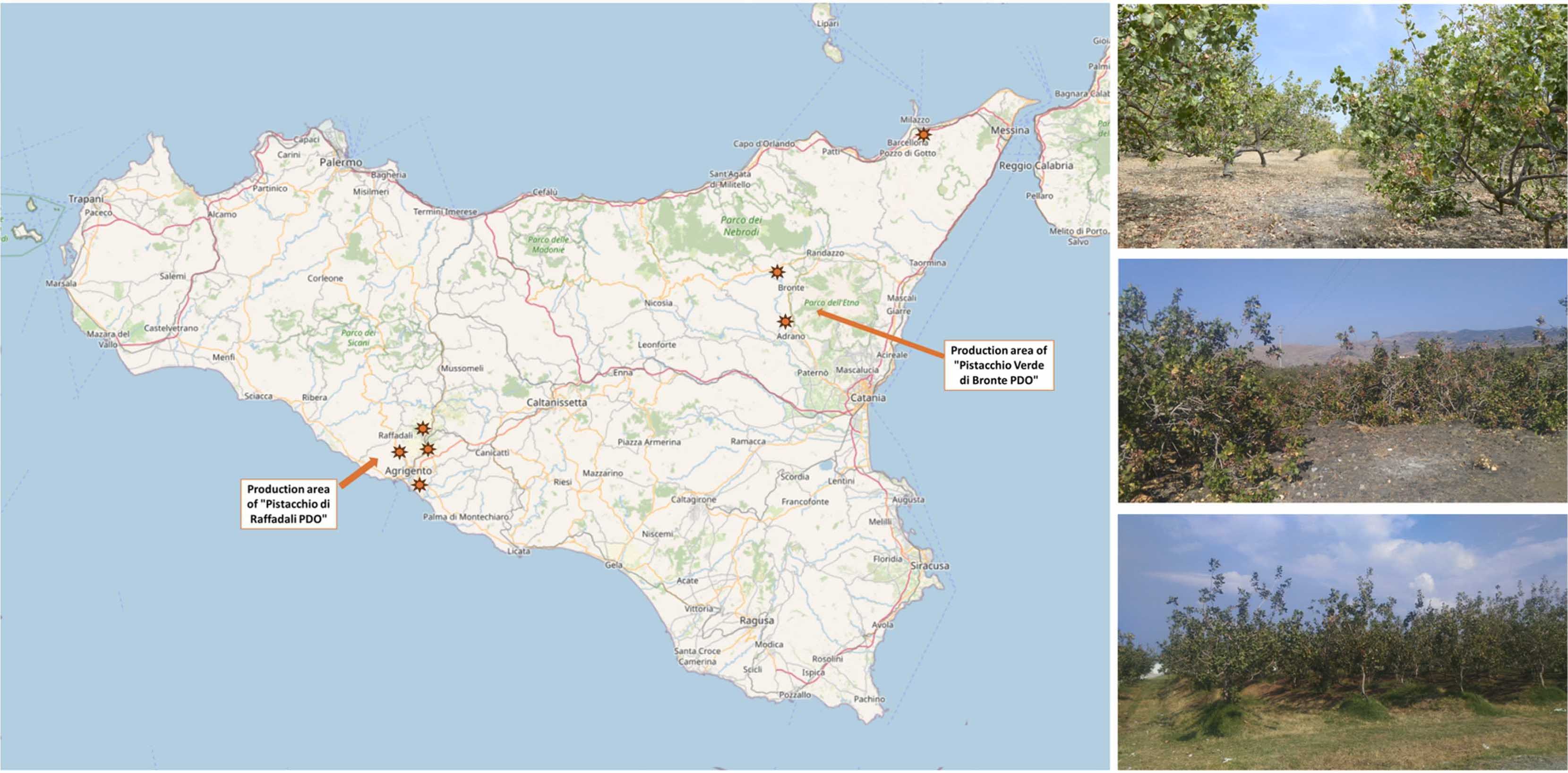 La mappa siciliana di produzione del Pistacchio verde di Bronte e di Raffadali
