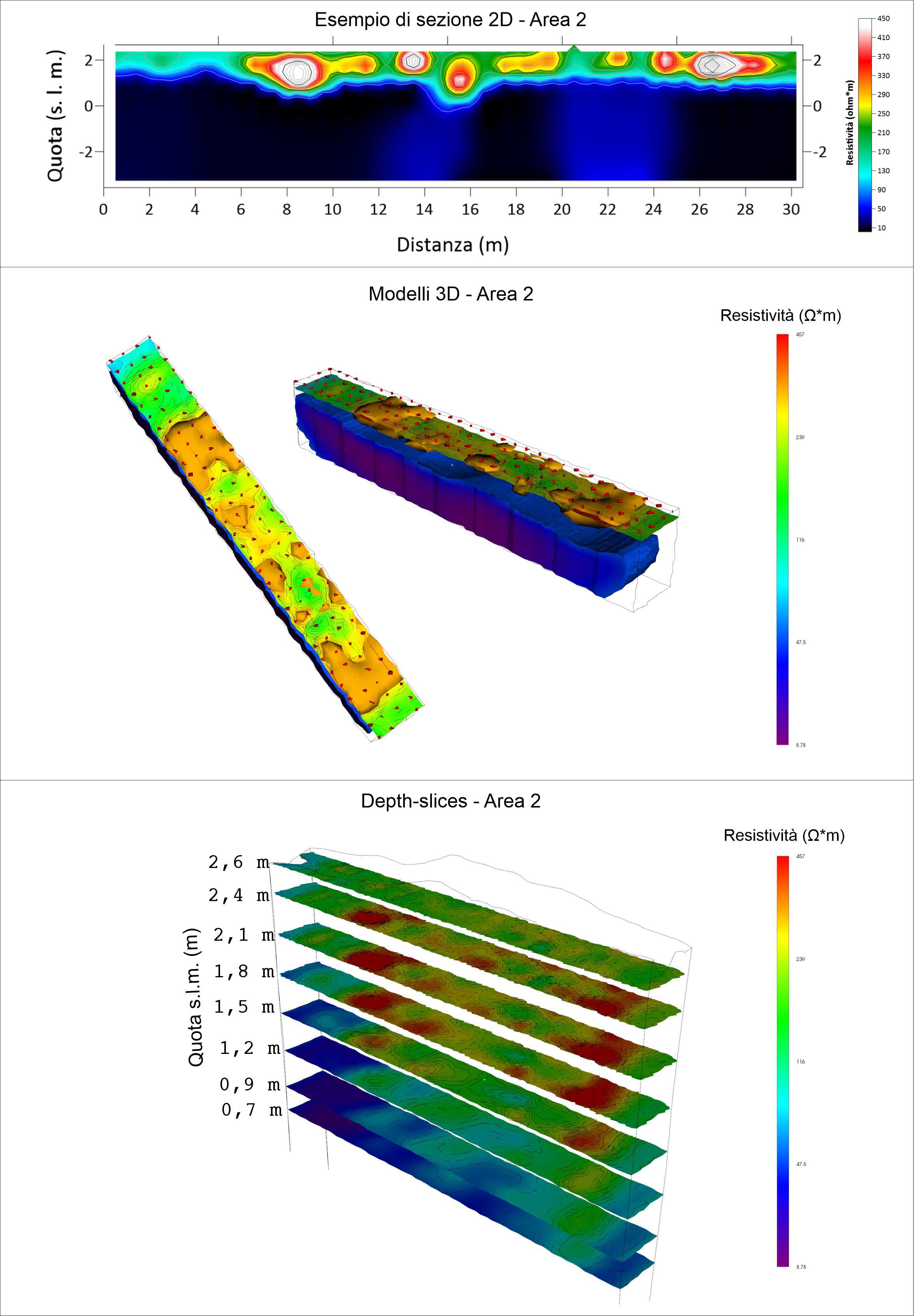 I risultati preliminari derivanti dal test eseguito nell’Area 2, mostrano la presenza di tre principali zone caratterizzate da valori ρ > 400 Ω m che risultano, anche in questo caso, avere dimensione, forma e posizione simili ai resti murari già portati in superficie nell’area adiacente.