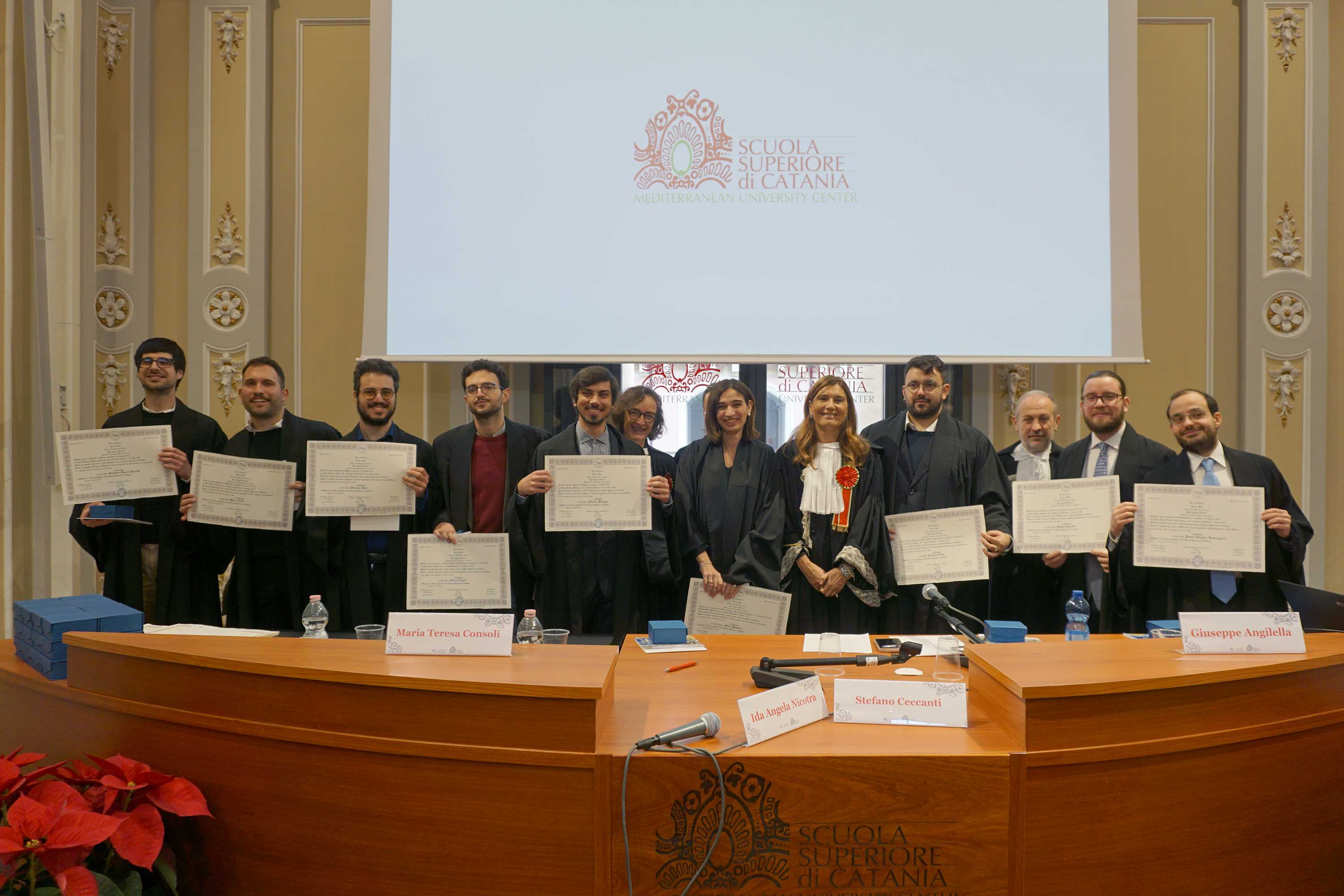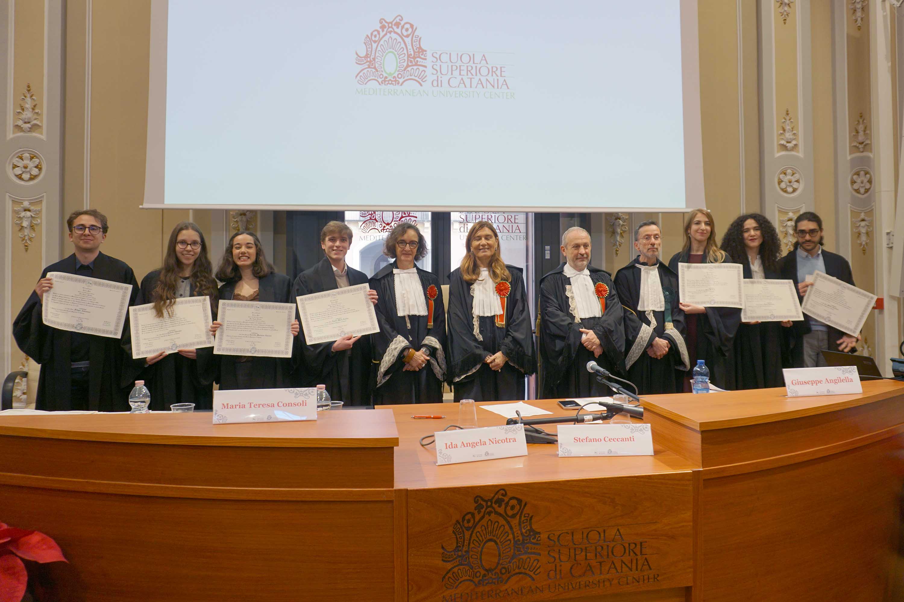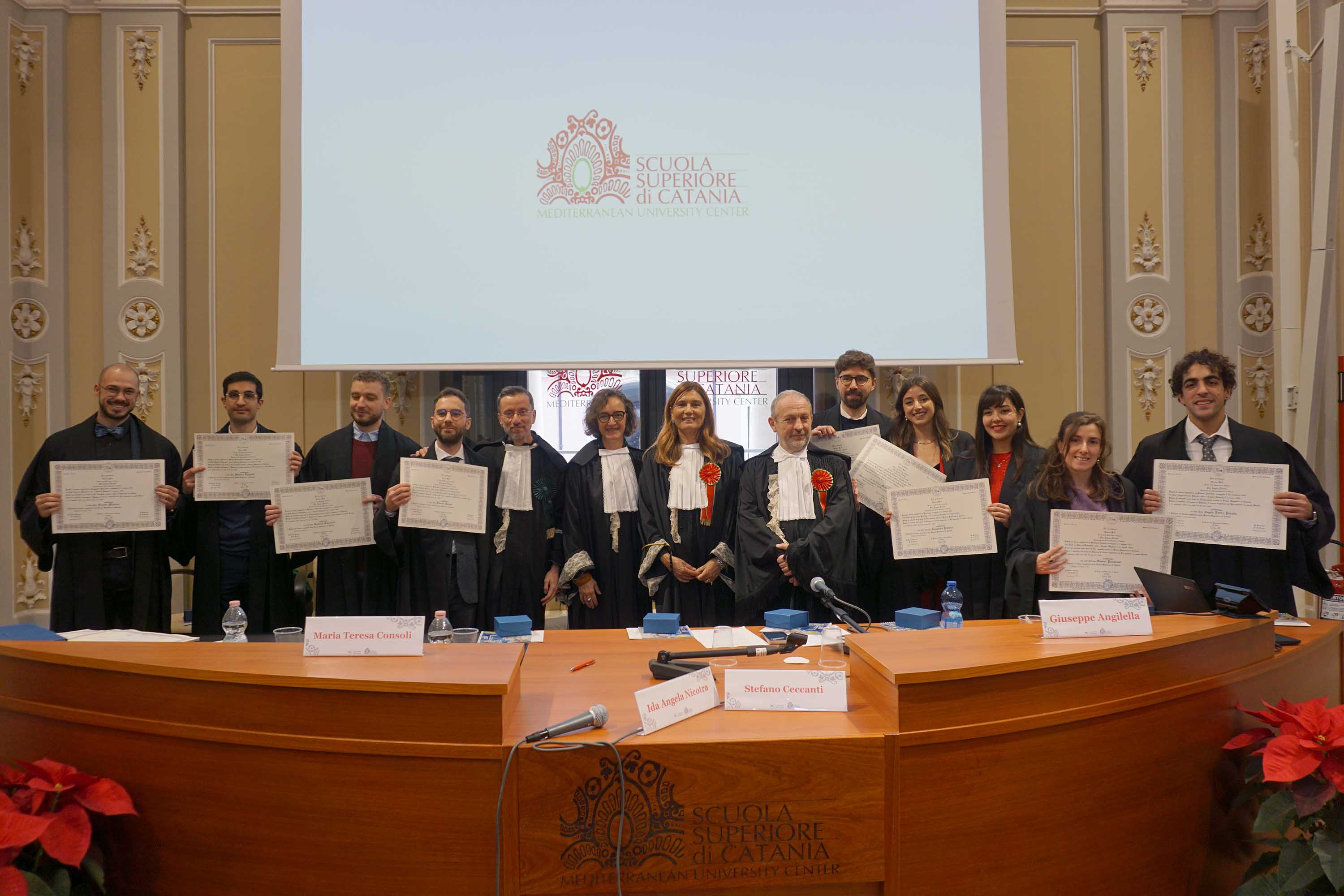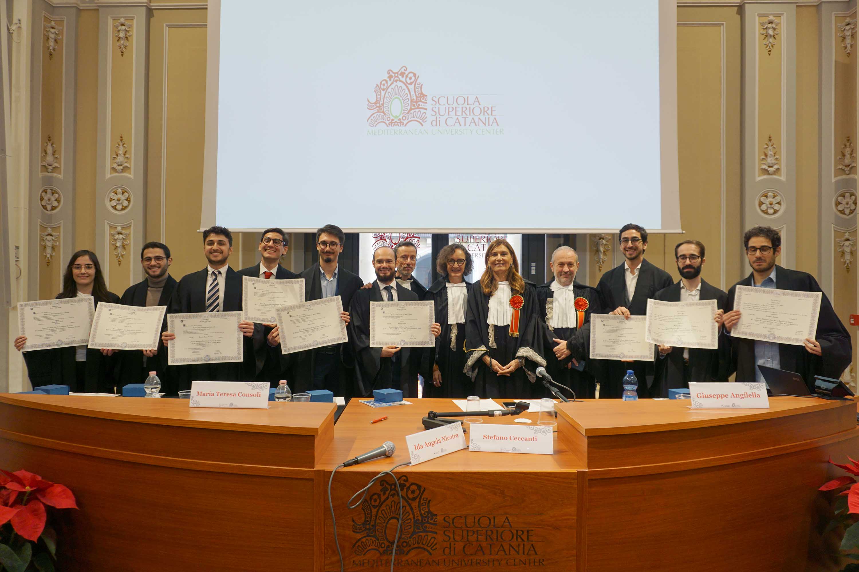 «Oggi è un giorno particolarmente felice», ha sottolineato il rettore Enrico Foti ricordando come questa «cerimonia rappresenti la celebrazione di un percorso fatto di impegno quotidiano, di studio e di relazioni costruite nel tempo». «Un percorso che non si esaurisce con la consegna del diploma, ma che prosegue nella responsabilità di restituire quanto ricevuto, attraverso il mentoring, l’ispirazione e il sostegno alle nuove generazioni, in una continuità di valori che tiene insieme chi esce e chi entra nella comunità della Scuola Superiore», ha tenuto a precisare il rettore.