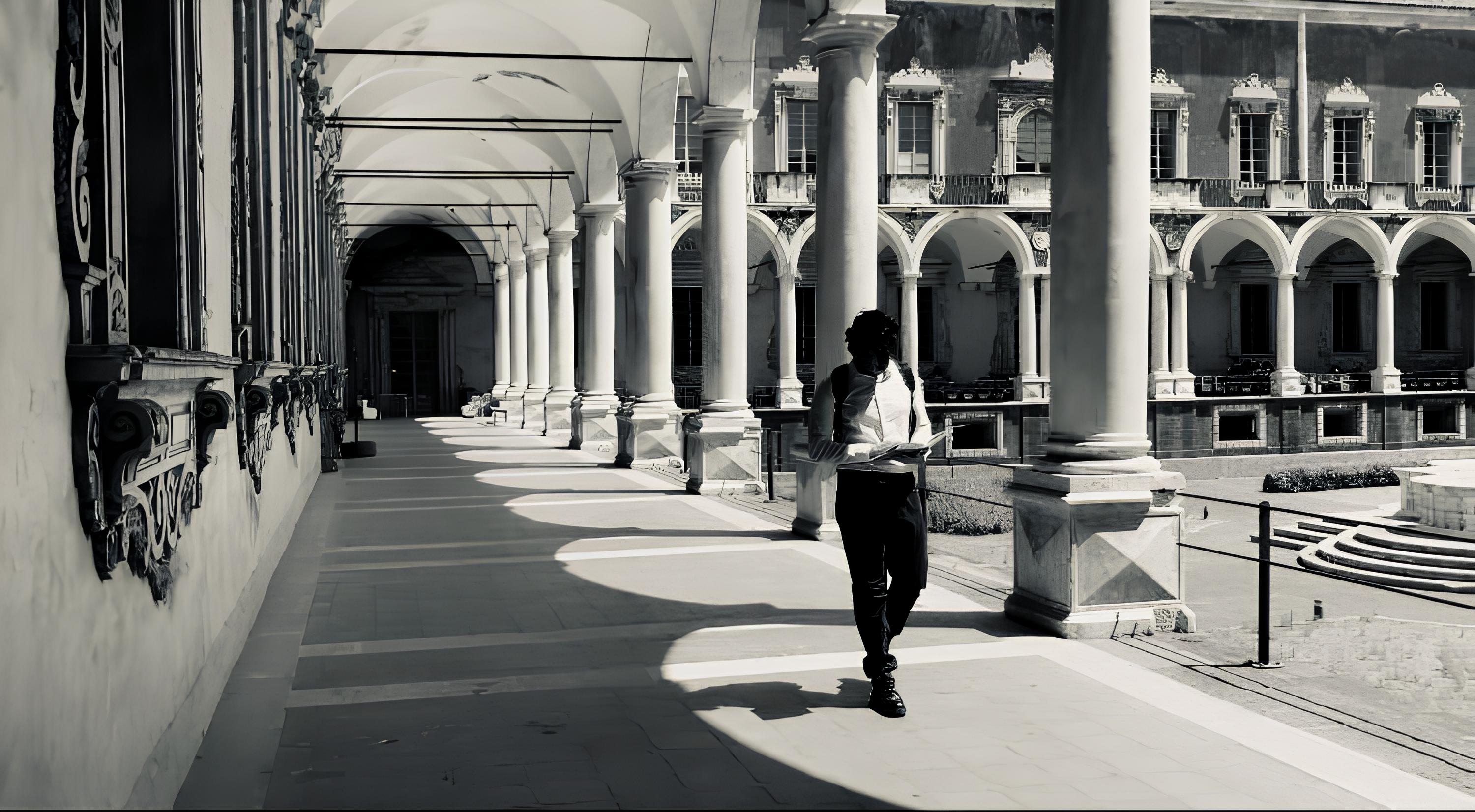 Lo studente Corrado Maria Minniti, nelle vesti di Giorgio, mentre passeggia lungo il cortile del Monastero dei Benedettini con una copia di 1984 di George Orwell