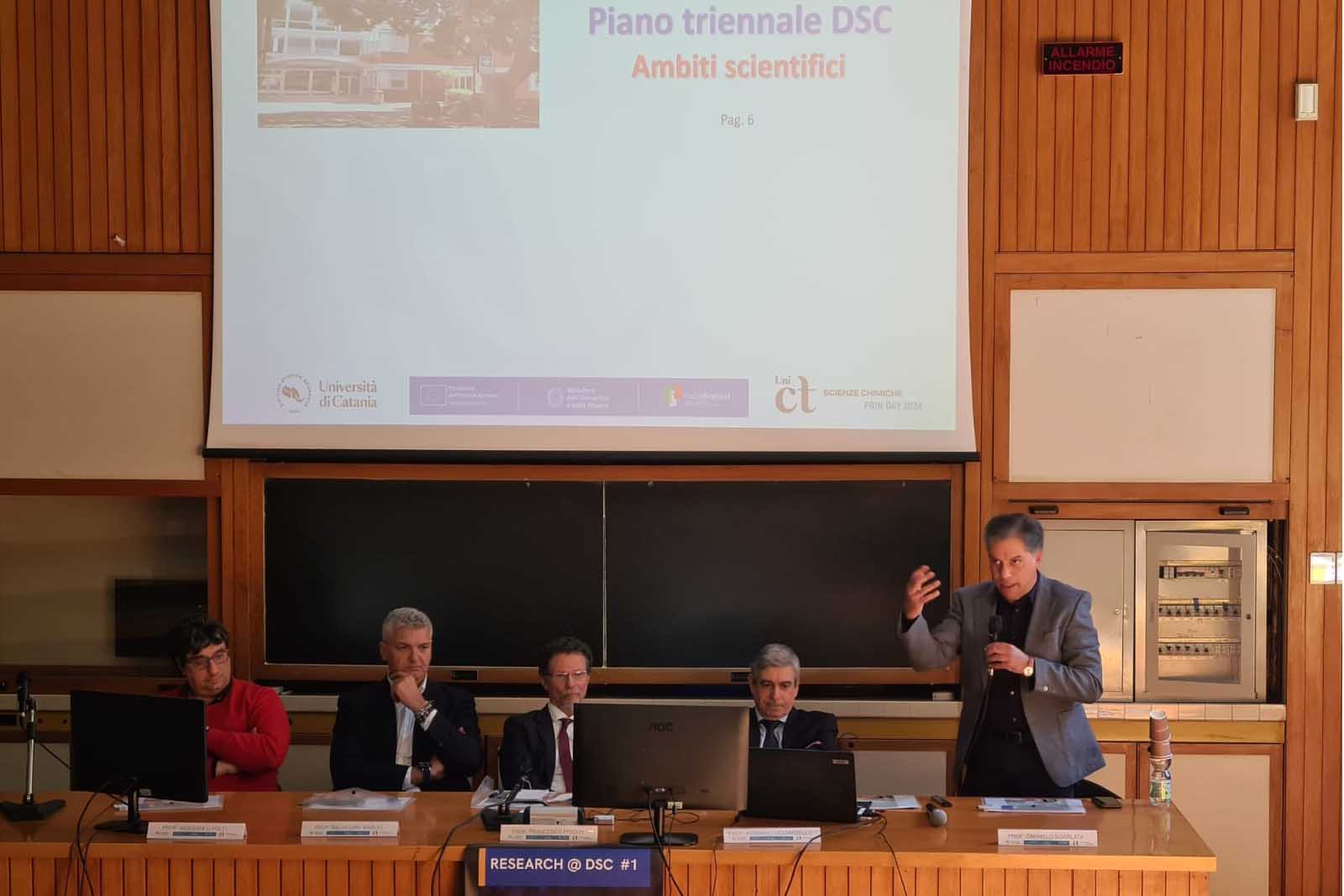 L’evento, denominato Prin Day 2024, si è svolto nell’aula magna del Dsc alla presenza del rettore Francesco Priolo, del coordinatore della cabina di regia della Ricerca Salvo Baglio e del delegato alla Ricerca in ambito biomedico Giovanni Li Volti. La presentazione ragionata del ‘portafoglio’ di progetti del dipartimento, articolata per macroambiti tematici, è stata invece affidata al prof. Carmelo Sgarlata, delegato alla Ricerca del Dsc, che ha “tirato la volata” alle efficaci presentazioni flash da parte degli autori dei progetti, accomunandoli con lo slogan “La chimica al servizio della società”.