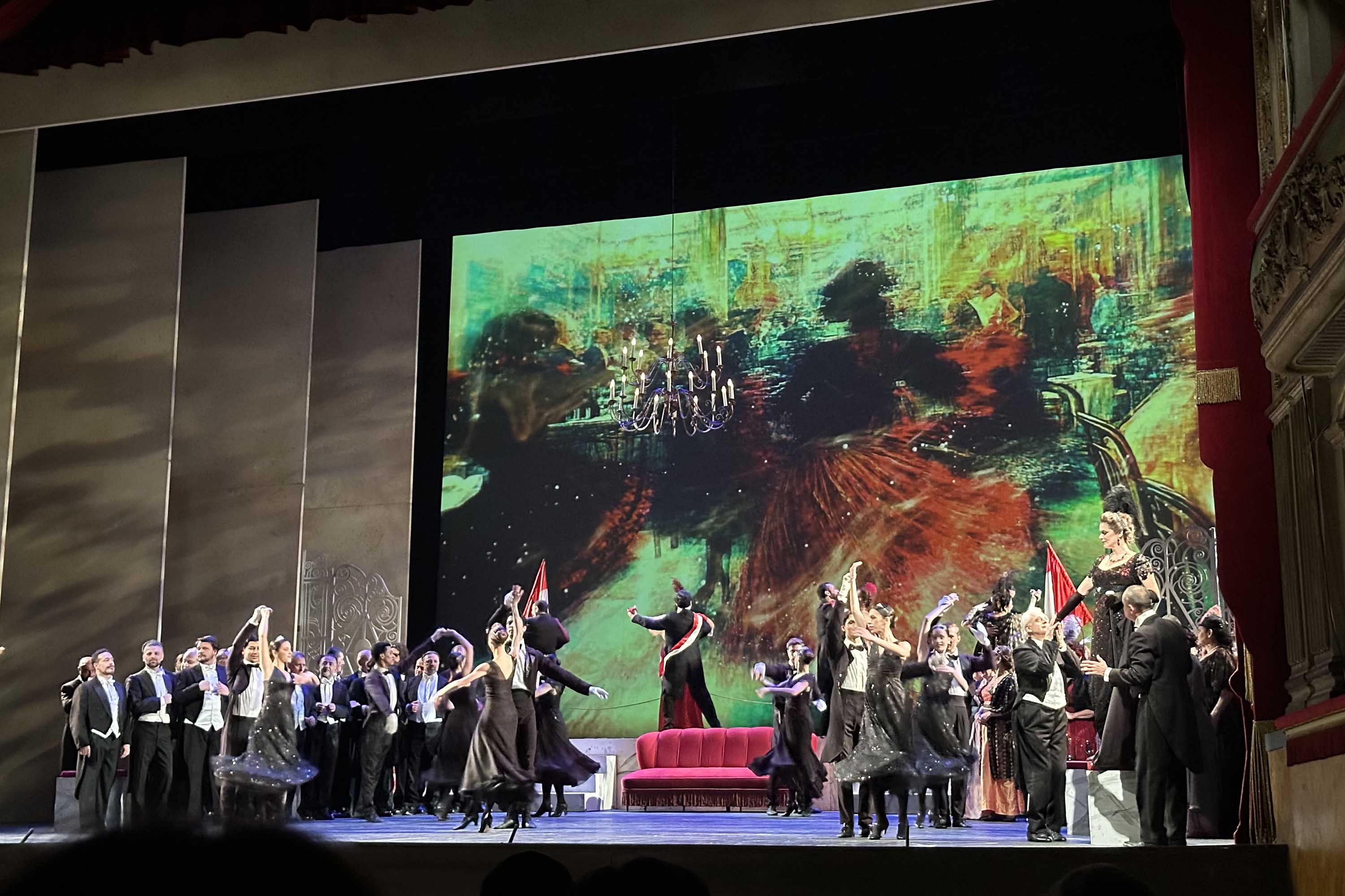 Ha dunque inizio l’ouverture, e la festa cristallizzata sul palco prende vita. La scena non è particolarmente ricca, l’elemento principale è lo schermo che mostra immagini evocative della belle époque, al quale vengono affiancati alcuni divani e uno sfolgorante lampadario.