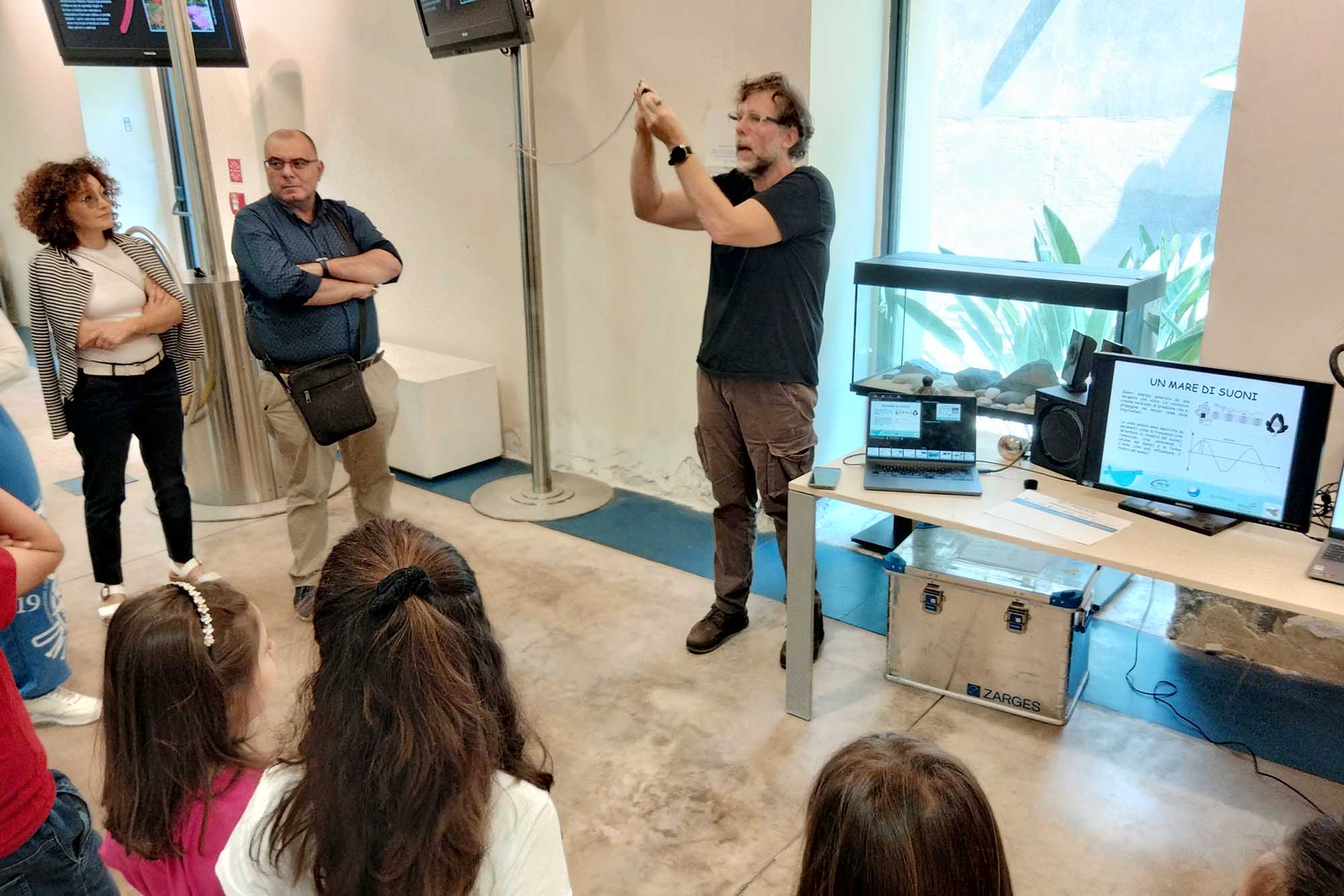 «Jacques-Yves Cousteau aveva definito il mare come il luogo del silenzio, ma in verità il mare è ricco di suoni perché l’acqua è un fluido e noi sappiamo che i fluidi propagano bene i suoni», ha detto il ricercatore Giorgio Riccobene dell’Infn Lns che, insieme con Abdelghani Idrissi e Salvo Viola, ha curato il laboratorio Un mare di suoni - Vedere senza luce.