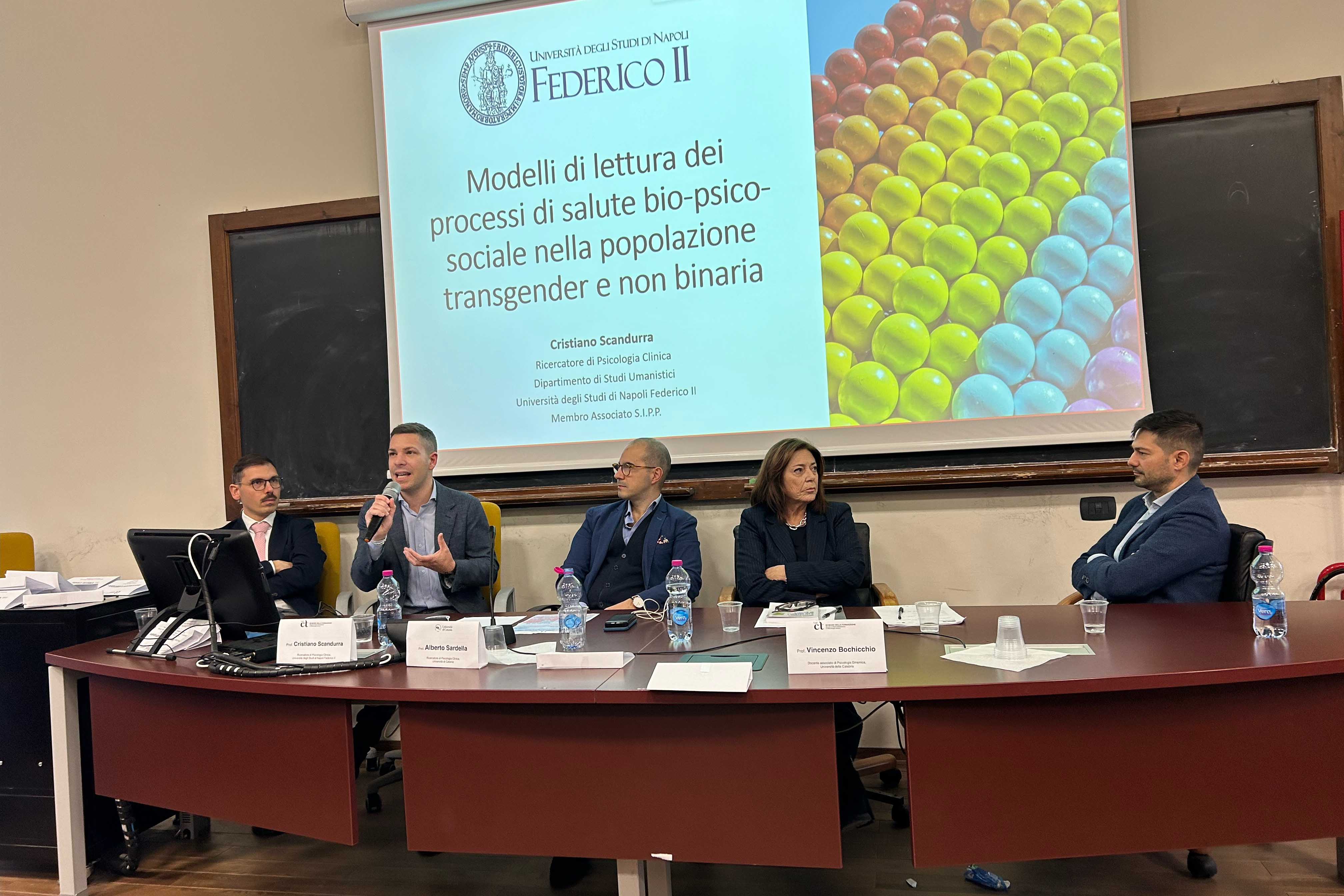 A seguire il professor Cristiano Scandurra, psicologo e ricercatore all’Università Federico II di Napoli, ha portato l’attenzione su un tema cruciale: il rapporto tra stigma, stress minoritario e salute biopsicosociale della popolazione LGBT+, con un focus particolare su persone transgender e non binarie.
